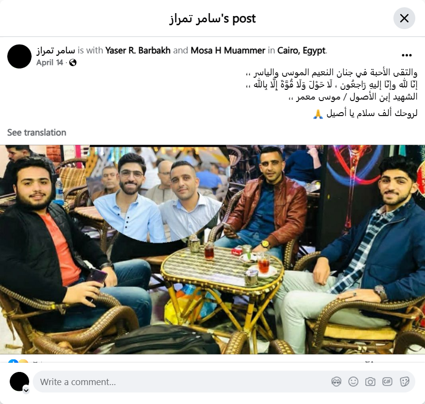 The beloved ones met in the gardens of bliss, Musa and Yasser. To God we belong and to Him we shall return. There is no power nor strength save with God. The martyr, son of the noble, Musa Muammar. A thousand peace be upon your soul, O noble one.