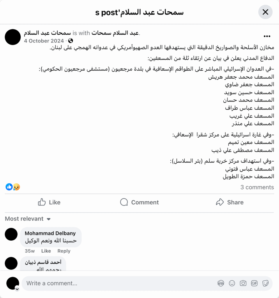مخازن الأسلحة والصواريخ الدقيقة التي يستهدفها العدو الصهيوأمريكي في عدوانه الهمجي على لبنان.الدفاع المدني يعلن في بيان عن ارتقاء ثلة من المسعفين:-في العدوان الإسرائيلي المباشر على الطواقم الإسعافية في بلدة مرجعيون (مستشفى مرجعيون الحكومي):المسعف محمد جعفر هريشالمسعف جعفر ضاويالمسعف حسين سويدالمسعف محمد حسانالمسعف عباس طرافالمسعف علي غريب المسعف علي منذر-وفي غارة اسرائيلية على مركز شقرا الإسعافي:المسعف معين تميمالمسعف مصطفى علي ذيب-وفي استهداف مركز خربة سلم (بئر السلاسل):المسعف عباس فتونيالمسعف حمزة الطويل