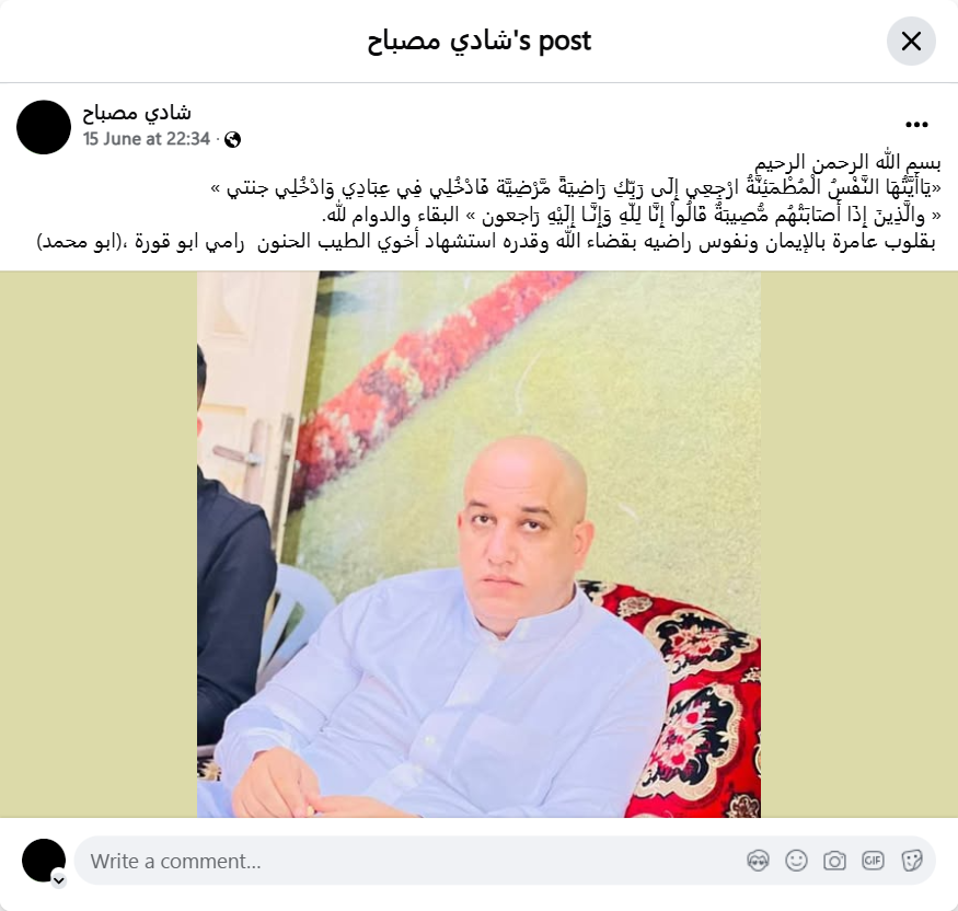In the name of Allah, the Most Gracious, the Most Merciful “O reassured soul, return to your Lord, well-pleased and pleasing [to Him], and enter among My servants and enter My Paradise.” “And those who, when disaster strikes them, say, “Indeed we belong to Allah, and indeed to Him we will return.”” To Allah belongs permanence and eternity. With hearts filled with faith and souls content with Allah’s will and destiny, the martyrdom of my kind and compassionate brother, Rami Abu Qura (Abu Muhammad)
