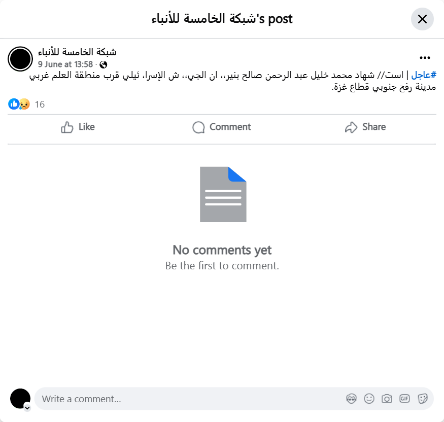 #Urgent | Martyrdom of Muhammad Khalil Abdul Rahman Saleh Binir, the army, Al-Isra Street, near the Al-Alam area, west of Rafah City, south of the Gaza Strip.
