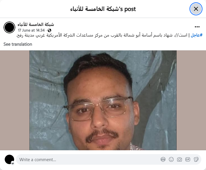 #عاجل | است//، شهاد باسم أسامة أبو شمالة بالقرب من مركز مساعدات الشركة الأمريكية غربي مدينة رفح.