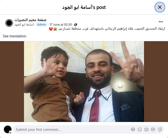 The death of our dear friend Alaa Ibrahim Al-Zainati, who was targeted near the Netzarim area.