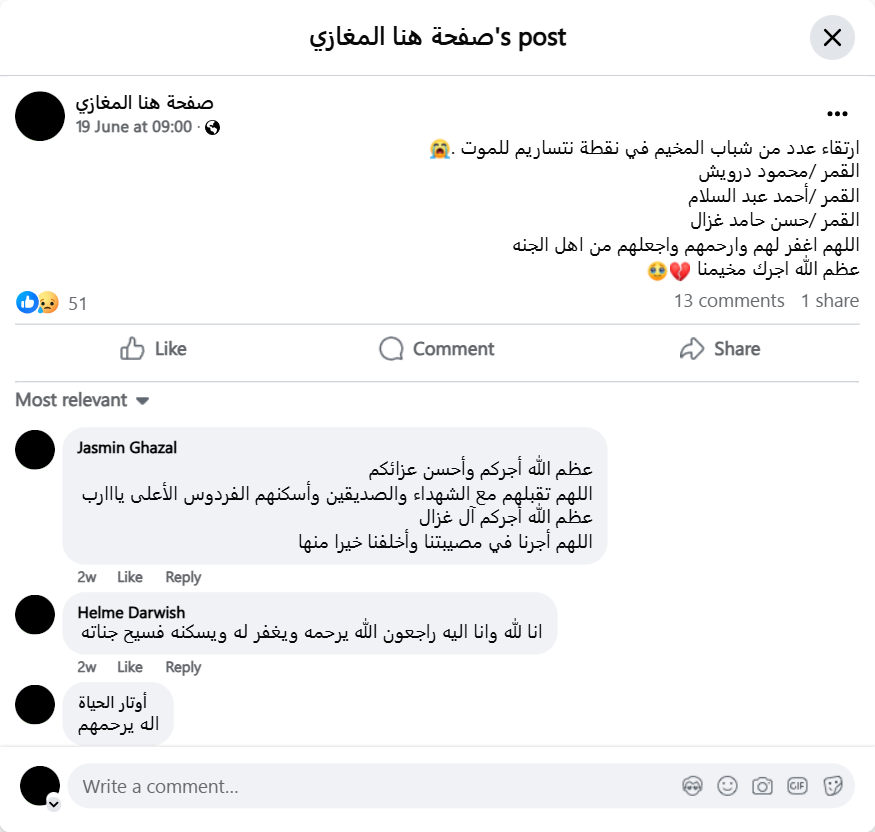 ارتقاء عدد من شباب المخيم في نقطة نتساريم للموت .القمر /محمود درويش القمر /أحمد عبد السلام القمر /حسن حامد غزال اللهم اغفر لهم وارحمهم واجعلهم من اهل الجنه عظم الله اجرك مخيمنا