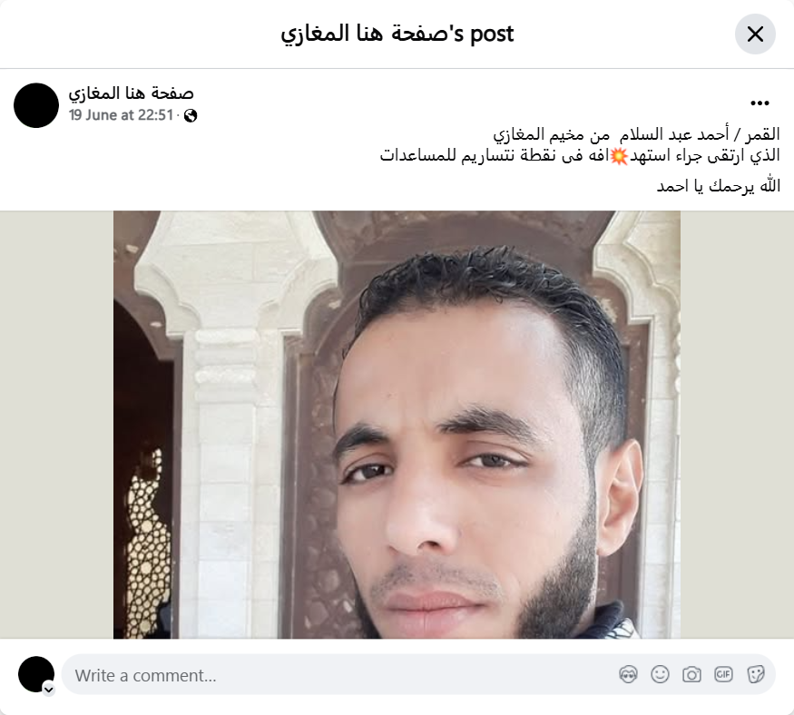 Al-Qamar / Ahmed Abdel Salam from Al-Maghazi camp, who was martyred as a result of being targeted at the Netzarim aid point. May God have mercy on you, Ahmed.