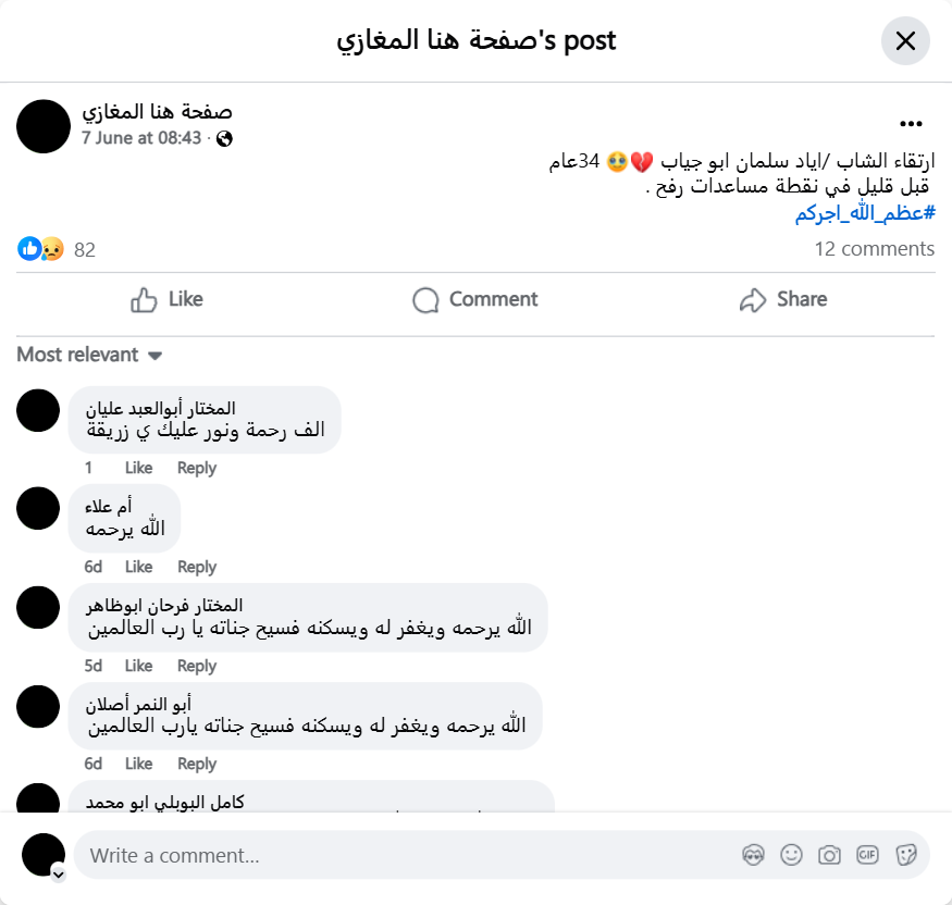 The young man, Ayad Salman Abu Jiab, 34 years old, passed away a short while ago at the Rafah aid point. #May_God_reward_you