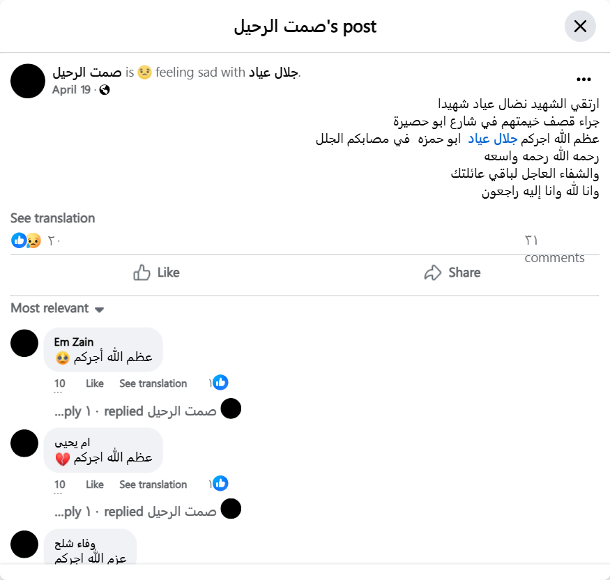 Martyr Nidal Ayyad was martyred as a result of the bombing of their tent on Abu Hasira Street. May God reward you, Jalal Ayyad Abu Hamza, for your great loss. May God have mercy on him and grant a speedy recovery to the rest of your family. To God we belong and to Him we shall return.