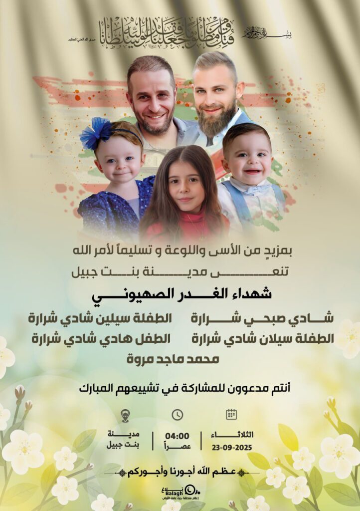 With deep sorrow and grief, and in submission to God's will, the city of Bint Jbeil mourns the martyrs of Zionist treachery: