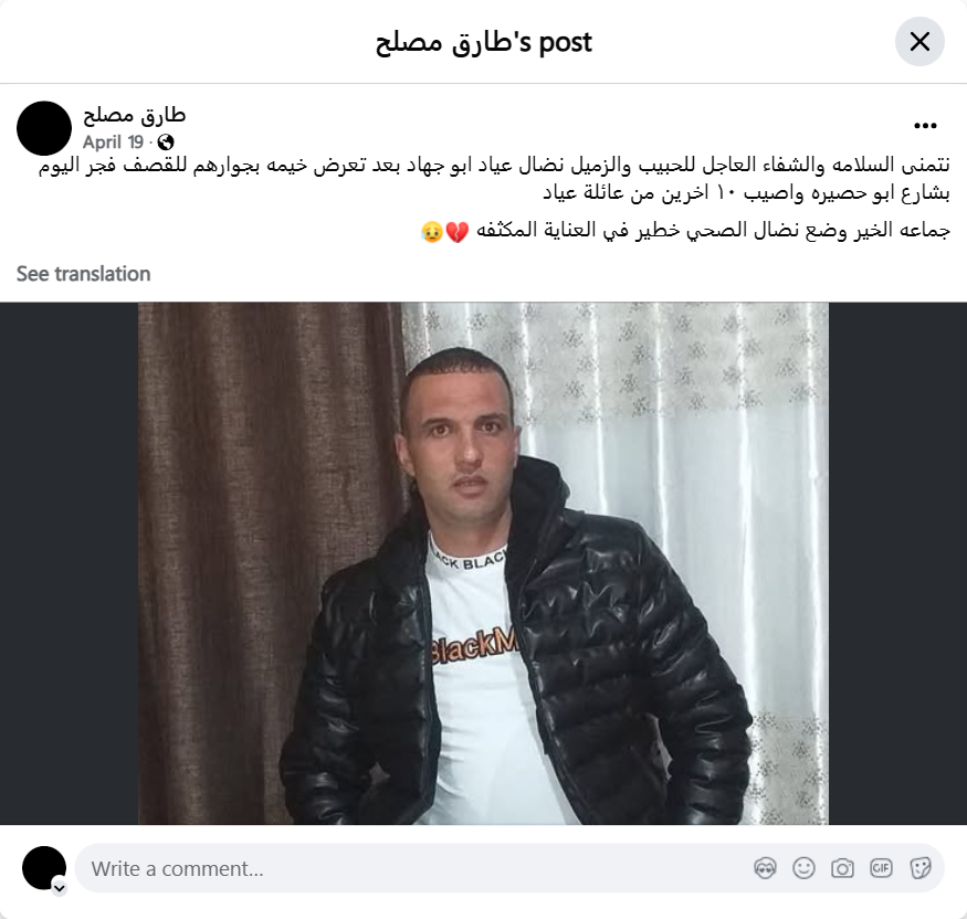 We wish safety and a speedy recovery to our dear colleague Nidal Ayyad Abu Jihad after a tent next to them was bombed at dawn today on Abu Hasira Street, and 10 others from the Ayyad family were injured.