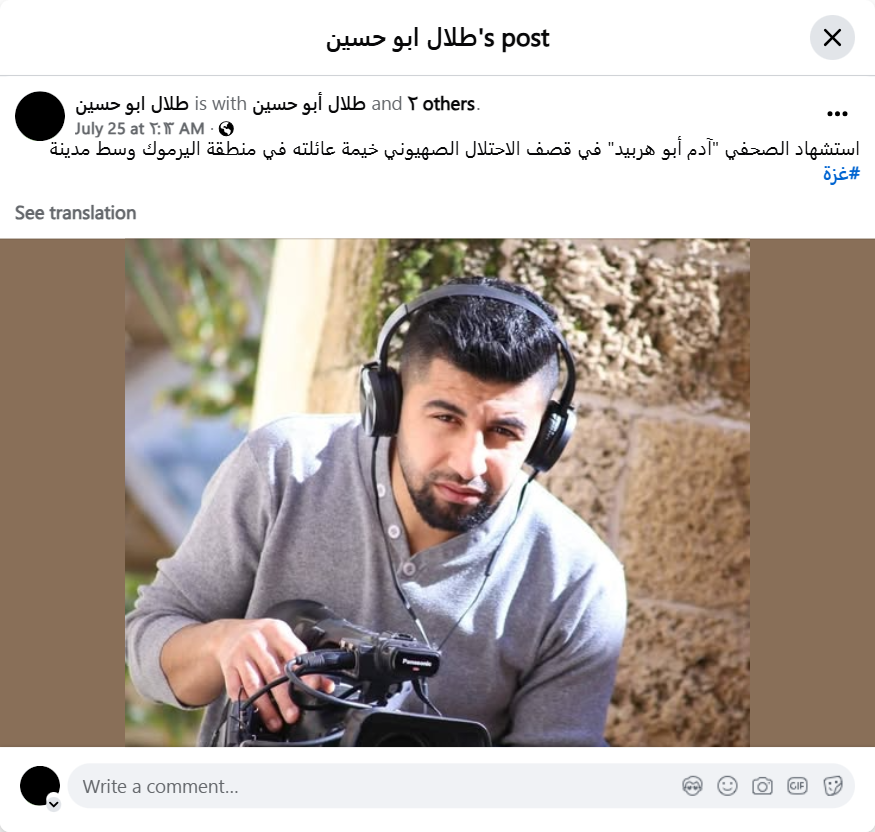 استشهاد الصحفي "آدم أبو هربيد" في قصف الاحتلال الصهيوني خيمة عائلته في منطقة اليرموك وسط مدينة #غزة