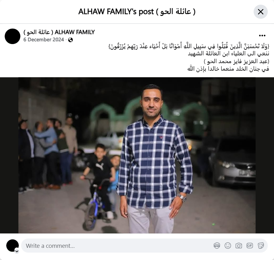 {And never think that those who were killed in the cause of Allah are dead. Rather, they are alive with their Lord, and they are provided for.} We announce to the highest heaven the death of the family member, the martyr (Abdul Aziz Fayez Muhammad Al-Haw), in the eternal gardens, enjoying eternal life, God willing.