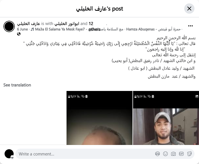 My cousin, the martyr Nader Rafiq Al-Batsh (Abu Yahya), the martyr Walid Adel Al-Batsh (Abu Adel), and the martyr Abdul Mazen Al-Batsh have passed away to the mercy of God Almighty.