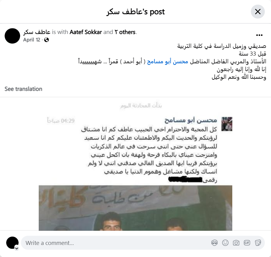 My friend and classmate in the College of Education 33 years ago, the virtuous teacher and struggling educator Mohsen Abu Musameh (Abu Ahmed), a moon... a martyreeee