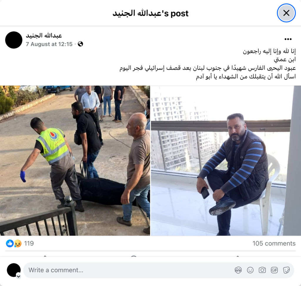 My cousin, Aboud Al-Yahya Al-Fares, was martyred in southern Lebanon after an Israeli bombardment this morning.