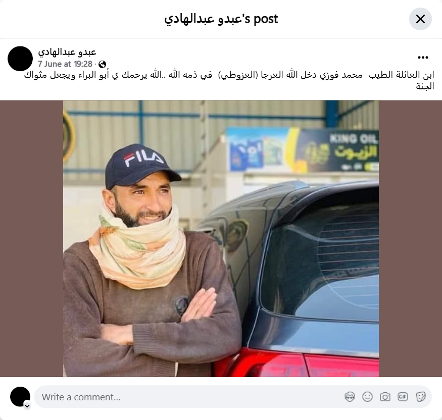 ابن العائلة الطيب محمد فوزي دخل الله العرجا (العزوطي) في ذمه الله ..الله يرحمك ي أبو البراء ويجعل مثواك الجنة