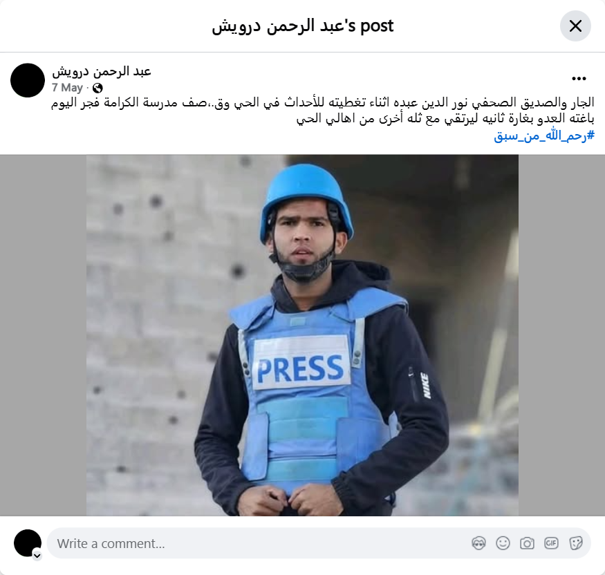 Neighbor and friend, journalist Nour El-Din Abdo, while covering the events in the neighborhood and the Al-Karama School class at dawn today, the enemy surprised him with a second raid, and he was killed along with a group of other neighborhood residents. #May_God_have_mercy_on_those_who_went_first
