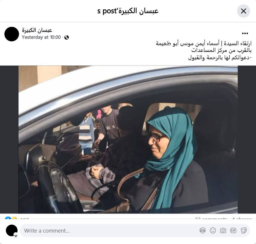 ارتقاء السيدة | أسماء أيمن موسى أبو طعيمةبالقرب من مركز المساعدات -دعواتكم لها بالرحمة والقبول