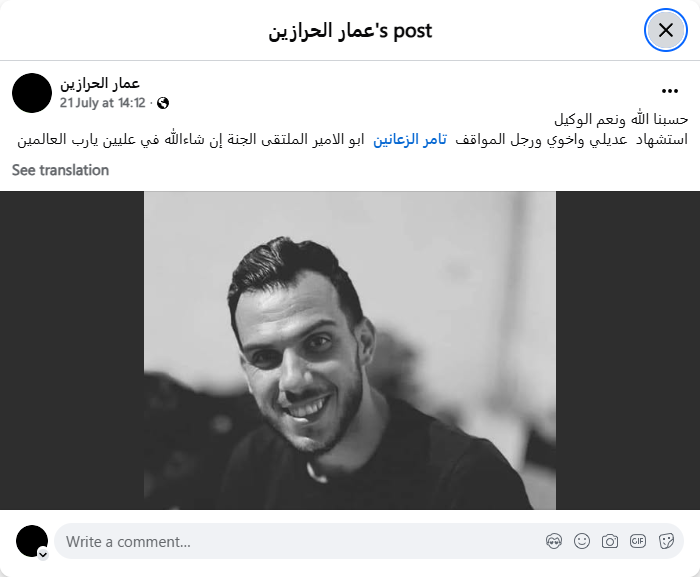 God is sufficient for us, and He is the best Disposer of affairs. The martyrdom of my friend, my brother, and the man of action, Tamer Al-Za'anin, Abu Al-Amir Al-Multaqa. May God grant him Paradise in the highest place, O Lord of the Worlds.