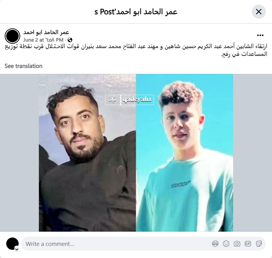 ‏ارتقاء الشابين أحمد عبد الكريم حسين شاهين و مهند عبد الفتاح محمد سعد بنيران قوات الاحـتـلال قرب نقطة توزيع المساعدات في رفح.