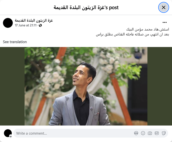 Martyrdom of Muhammad Mumin Al-Bayk. After he finished his prayer, the sniper surprised him with a bullet to the head.