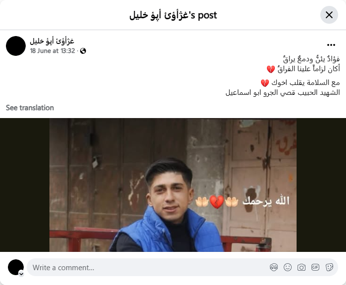 Goodbye, your dear martyred brother Qusay Al-Jarou Abu Ismail