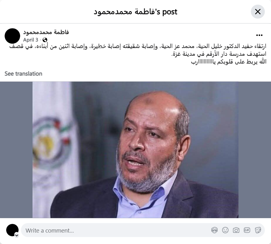 Dr. Khalil Al-Hayya's grandson, Mohammed Ezz Al-Hayya, was killed, his sister was seriously injured, and two of his sons were injured in a bombing that targeted Dar Al-Arqam School in Gaza City.