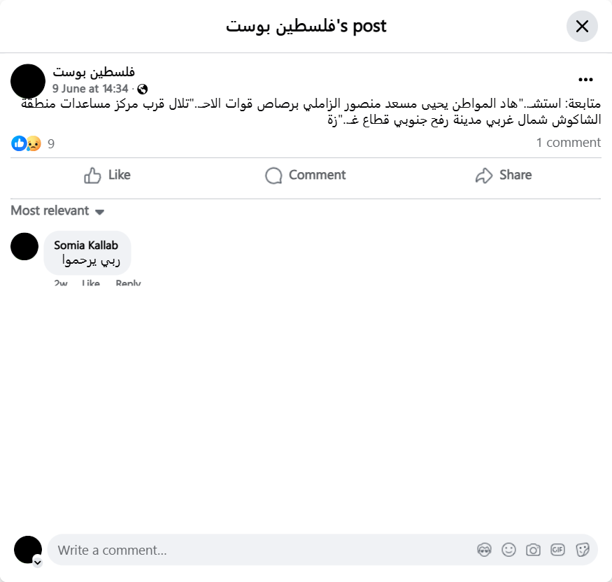 Follow-up: Citizen Yahya Masoud Mansour Al-Zamili was martyred by the bullets of the occupation forces near the aid center in the Al-Shakoush area, northwest of Rafah, in the southern Gaza Strip.