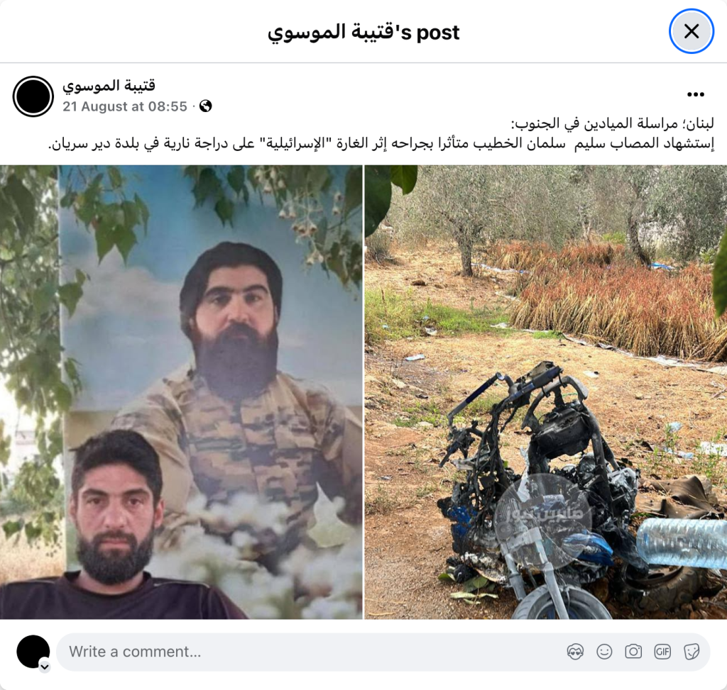 إستشهاد المصاب سليم سلمان الخطيب متأثرا بجراحه إثر الغارة "الإسرائيلية" على دراجة نارية في بلدة دير سريان.