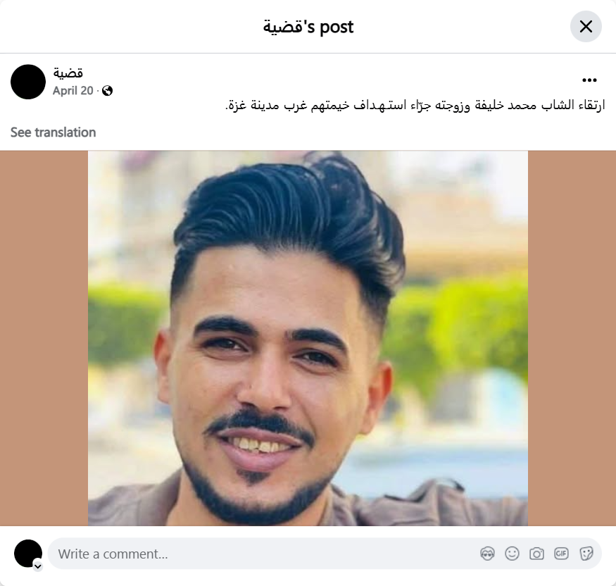 The young man, Mohammed Khalifa, and his wife were killed when their tent was targeted in western Gaza City.
