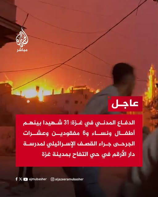 عاجل | الدفاع المدني في #غزة: 31 شهيدا بينهم أطفال ونساء و6 مفقودين وعشرات الجرحى جراء القصف الإسرائيلي لمدرسة دار الأرقم في #حي_التفاح بمدينة غزة
