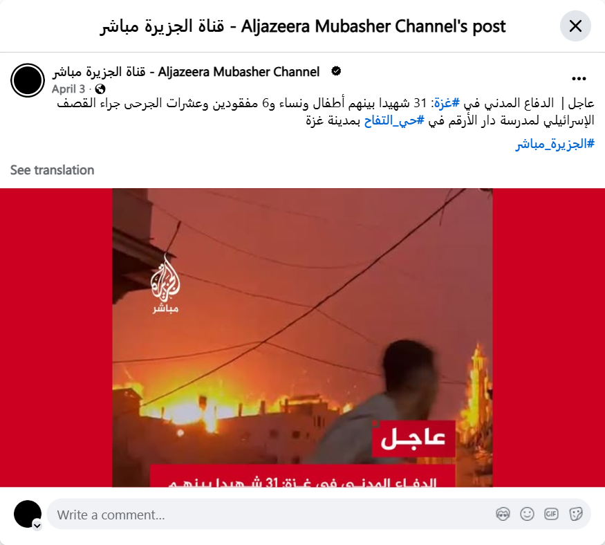 Archive URL: https://airwars.org/source/www-facebook-com-%d9%82%d9%86%d8%a7%d8%a9-%d8%a7%d9%84%d8%ac%d8%b2%d9%8a%d8%b1%d8%a9-%d9%85%d8%a8%d8%a7%d8%b4%d8%b1-aljazeera-mubasher-channel-pfbid0yfcr4hquu1djzm15ph6ecthxwrg69epnddft7nhzh8mvq/