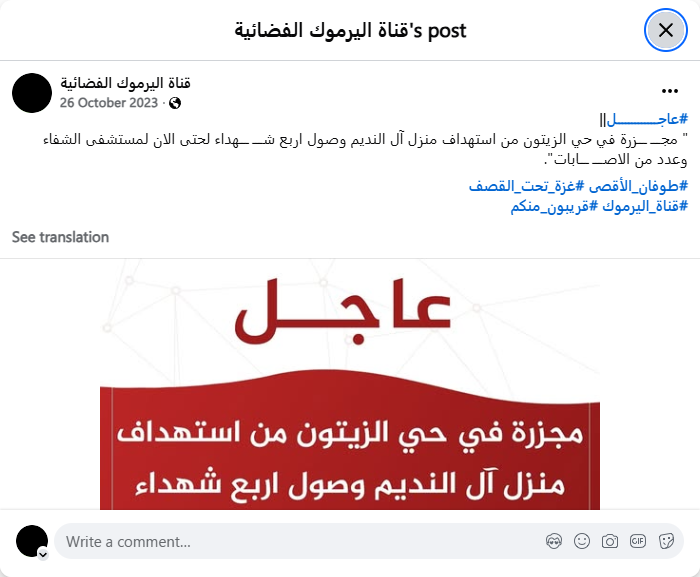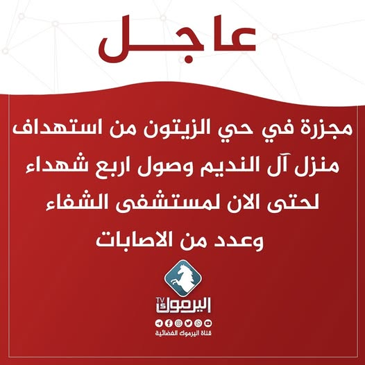 " مجـــ ـــزرة في حي الزيتون من استهداف منزل آل النديم وصول اربع شـــ ـــهداء لحتى الان لمستشفى الشفاء وعدد من الاصـــ ـــابات".