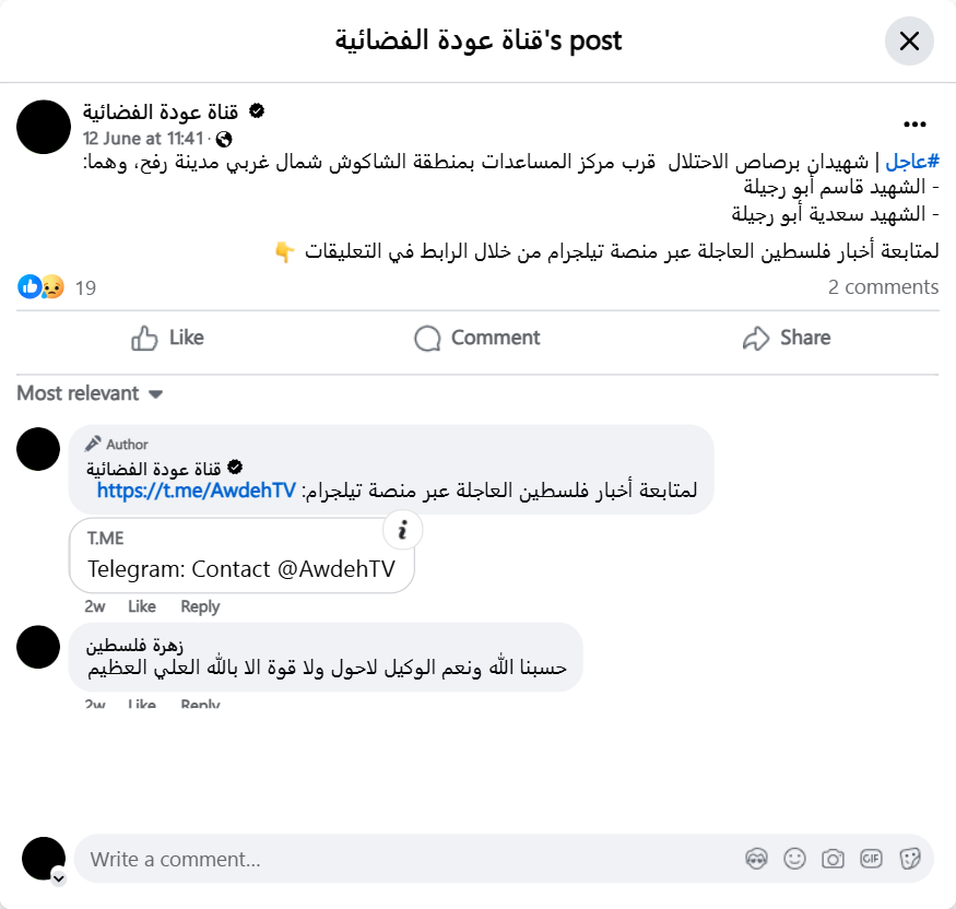 #Urgent | Two martyrs were shot by the occupation forces near the aid center in the Al-Shakoush area, northwest of Rafah. They are: - Martyr Qassem Abu Rajila - Martyr Saadia Abu Rajila To follow breaking Palestinian news on Telegram, follow the link in the comments.