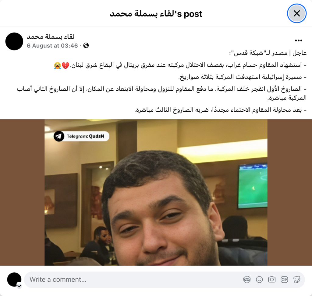 - الصاروخ الأول انفجر خلف المركبة، ما دفع المقاوم للنزول ومحاولة الابتعاد عن المكان، إلا أن الصاروخ الثاني أصاب المركبة مباشرة.