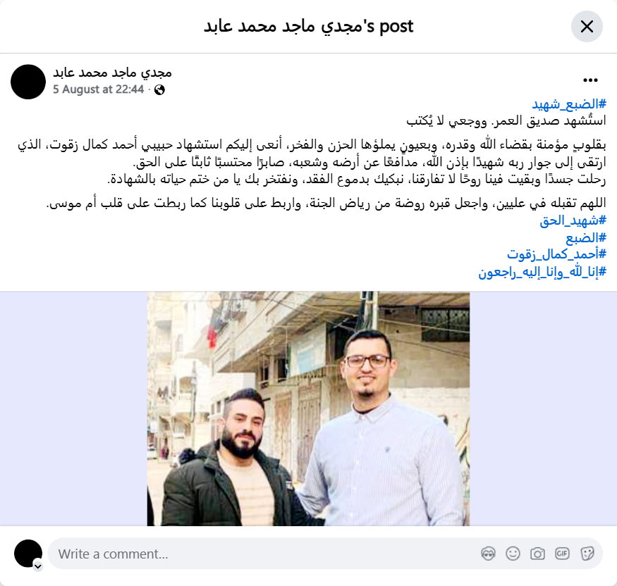 With hearts that believe in God's will and destiny, and with eyes filled with sadness and pride, I announce to you the martyrdom of my beloved Ahmed Kamal Zaqout, who ascended to his Lord as a martyr, God willing, defending his land and people, patient, content, and steadfast in the truth.