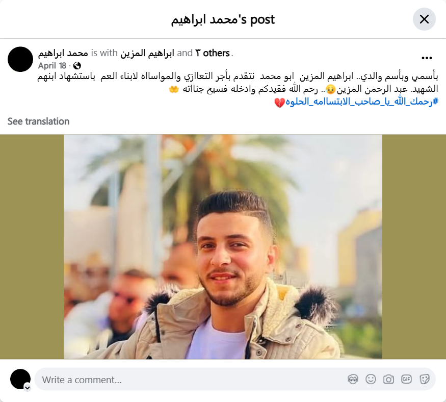 بأسمي وبأسم والدي.. ابراهيم المزين ابو محمد نتقدم بأجر التعاازي والمواسااه لابناء العم باستشهاد ابنهم الشهيد. عبد الرحمن المزين.. رحم الله فقيدكم وادخله فسيح جنااته