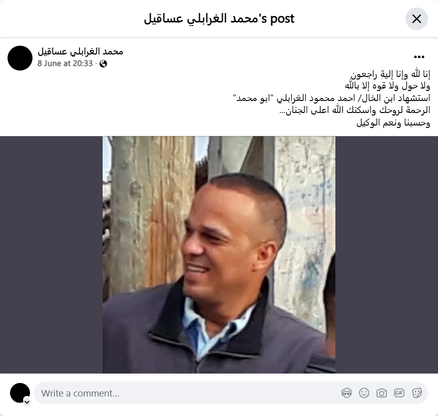 We belong to Allah and to Him we shall return. There is no power nor strength save with Allah. The martyrdom of my cousin, Ahmed Mahmoud Al-Gharabli “Abu Muhammad.” May God have mercy on your soul and grant you the highest place in Paradise. We are sufficient, and He is the best Disposer of affairs.