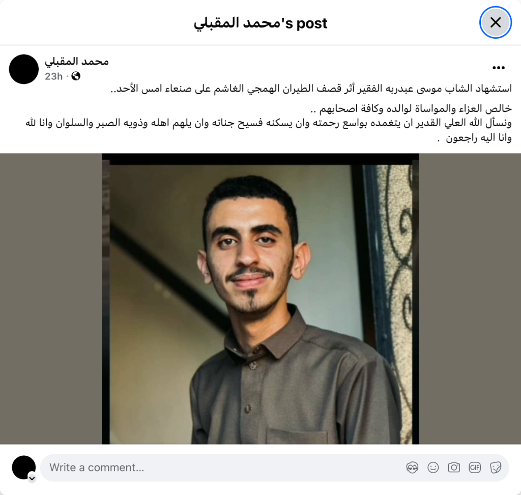 استشهاد الشاب موسى عبدربه الفقير أثر قصف الطيران الهمجي الغاشم على صنعاء امس الأحد..