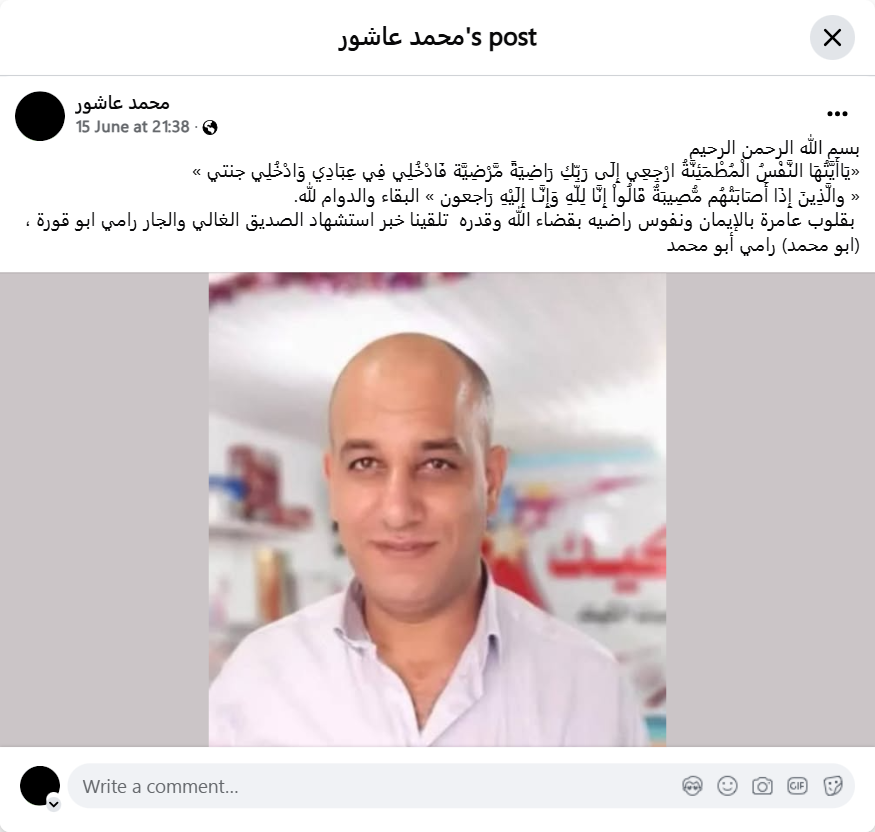 In the name of God, the Most Gracious, the Most Merciful “O reassured soul, return to your Lord, well-pleased and pleasing [to Him], and enter among My servants and enter My Paradise.” “And those who, when disaster strikes them, say, “Indeed we belong to God, and indeed to Him we will return.”” To God belongs permanence and eternity. With hearts filled with faith and souls content with God’s will and destiny, we received the news of the martyrdom of our dear friend and neighbor, Rami Abu Qura (Abu Muhammad) Rami Abu Muhammad
