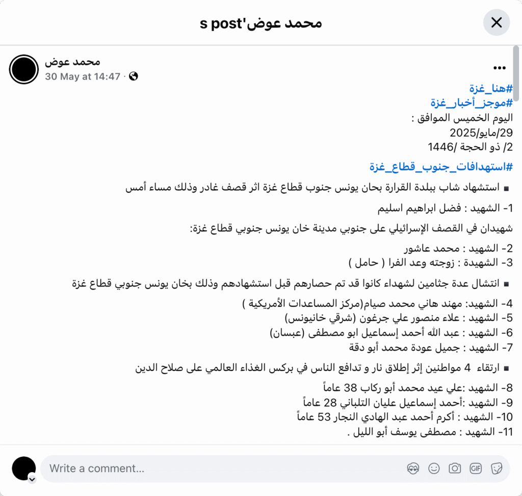 #Here_is_Gaza#Gaza_News_Summary Today Thursday: May 29, 2025 Dhu al-Hijjah 2, 1446#Targeting_South_Gaza_Strip A young man was martyred in the town of Al-Qarara in Khan Yunis, south of the Gaza Strip, as a result of a treacherous bombing yesterday evening 1- Martyr: Fadl Ibrahim Aslim Two martyrs in the Israeli bombing of the south of Khan Yunis, south of the Gaza Strip: 2- Martyr: Muhammad Ashour 3- Martyr: His wife Waad Al-Farra (pregnant) Recovering several bodies of martyrs who had been besieged before their martyrdom in Khan Yunis, south of the Gaza Strip 4- Martyr: Muhannad Hani Muhammad Siam (US Aid Center) 5- Martyr: Alaa Mansour Ali Jarghoun (east of Khan Yunis) 6- Martyr: Abdullah Ahmed Ismail Abu Mustafa (Abasan) 7- Martyr: Jamil Awda Muhammad Abu Daqqa 4 citizens were killed as a result of gunfire and a stampede in the World Food Barracks on Salah al-Din 8- Martyr: Ali Eid Muhammad Abu Rakab, 38 years old 9- Martyr: Ahmed Ismail Alian Al-Talbani, 28 years old 10- Martyr: Akram Ahmed Abdel Hadi Al-Najjar, 53 years old 11- Martyr: Mustafa Yousef Abu Al-Layl. Two martyrs were shot near the aid center of the American company in Rafah city, and they are: - 12- Martyr: Ahmed Hosni Shahin 13- Martyr: Nimer Attia Eid Abu Jlidan. Retrieving the body of a martyr from a house that was bombed in Abasan Al-Kabira, east of Khan Yunis, south of the Gaza Strip. 14- Martyr: Abdullah Iyad Samir Abu Khater. A citizen from the Al-Janina neighborhood, east of Rafah, died of his wounds as a result of a previous bombing in Deir Al-Balah. 15- Martyr: Ahmed Mahmoud Abdel Aal. A citizen was martyred as a result of bombing by an Israeli drone on a group of citizens in the Qizan Rashwan area, south of Khan Yunis. 16- Martyr: Hisham Musa Nemat Rashwan. Martyrs as a result of bombing by the Israeli occupation in the Qizan Al-Najjar area. South of Khan Yunis city. 17- Martyr: Muhammad Hisham Faisal Judeh 18- Martyr Ahmad Abu Al-Baraa An elderly man was killed while fleeing in Khan Yunis Martyr: Sheikh Manar Salem Al-Masry (Abu Bilal) A citizen was killed as a result of an Israeli bombing in Abasan Al-Kabira, east of Khan Yunis city. 19- Martyr: Tariq Al-Naqa Injured as a result of an Israeli bombing in Al-Sikka Street, in the Barbakh neighborhood, in the center of Khan Yunis Martyrs as a result of a bombing on a tent sheltering displaced people in Roni Street, in the Al-Mawasi area, west of Khan Yunis: 20- Martyr: Muhammad Hussein Ashour 21- Martyr: Muhammad Radwan Al-Lahham 22- Martyr: Osama Subhi Al-Lahham #Targeting_Al-Wasat A martyr and an injury as a result of targeting a tent in the Al-Salqawi land in the Al-Barakah area in the city of Deir Al-Balah. 23- Martyr: Ahmad Awad Muhammad Sarsour (13 years old) 23 Martyrs and wounded in an Israeli air strike on a house for the Al-Qarinawi family, east of Al-Bureij camp, in the central Gaza Strip 24- Martyr: Waseem Salah Saeed Abu Aoun 25- Martyr: Jude Abdel Aziz Mohammed Al-Muqadmeh 26- Martyr: Abdel Aziz Mohammed Shehada Al-Muqadmeh 27- Martyr: Yasser Ali Salem Abu Gharqoud 28- Martyr: Mahmoud Mufleh Hosni Abu Shamala 29- Martyr: Sayyaf Ezz El-Din Fares Saadoun 30- Martyr: Mahmoud Jamal Salman Al-Muqadmeh 31- Martyr: Raghda Jamal Salman Al-Muqadmeh 32- Martyr: Ramzi Ahmed Salman Al-Awdat 33- Martyr: Salman Rizq Salman Al-Qarnawi 34- Martyr: Jamal Salman Hussein Al-Muqadmeh 35- Martyr: Ali Yasser Ali Abu Gharqoud 36- Martyr: Abdullah Ibrahim Mahmoud Ruby 37- Martyr: Qusay Ramadan Abdullah Al-Qalqily 38- Martyr: Amani Khader Mohammed Saadoun 39- Martyr: Yahya Yasser Ali Abu Gharqoud 40- Martyr: Hamza Imad Azara 41- Martyr: Amal Salama Al-Qurainawi 42- Martyr: Ghazal Abdel Aziz Shahada Al-Muqadmeh 43- Martyr: Lana Abdel Aziz Shahada Al-Muqadmeh 44- Martyr: Muhammad Ahmed Salama Al-Qurainawi 45- Martyr: Narmin Al-Qurainawi 46- Martyr: Amira Muhammad Ahmed Salama Al-Qurainawi A citizen died of wounds he sustained in Deir Al-Balah several days ago. 47- Martyr: Ahmed Mahmoud Abdel Al-Kawad Kabter targeted a group of citizens with a bomb northeast of Al-Nuseirat camp, around the Al-Da’wa area, and an injured person was transferred to Al-Awda Hospital A number of citizens were lost while trying to receive aid near the Netzarim Junction Some young men are injured and bleeding, and no one can reach them #Gaza_Targets_East_West A citizen was martyred after checking on his home located next to Al-Bashir Mosque, in Al-Tuffah neighborhood, east of Gaza City 48- Martyr: Haitham Diab Al-Jamal Martyrs as a result of the story of a food bank next to Shaaban Al-Rayyes School in Al-Tuffah neighborhood, east of Gaza City 49- Martyr: Salim Muhammad Faraj Al-Mubaid 50- The Martyr: Muhammad Muhammad Faraj Al-Mubaid 51- The Martyr: Jamal Imad Jamal Faraj Al-Mubaid 52- The Martyr: Muhammad Jamal Al-Mubaid (Abu Janin) 53- The Martyr: Ahmad Matar Bustan (Abu Matar) 54- The Martyr: Moataz Muhammad Rajab 55- The Martyr: Ishaq Al-Tayf Robbers attack on Al-Sahaba Market in Gaza City.. The body of a citizen who was martyred was recovered as a result of targeting in Abasan Al-Kubra in Khan Yunis, south of the Gaza Strip 56- The Martyr Sheikh: Mahmoud Salman Ahmed Baraka “Abu Muhammad” A child died of wounds he sustained a few days ago in Al-Tuffah neighborhood, east of Gaza City 57- The Martyr Child: Alaa Essam Najib Hamada Non-stop targeting in the Al-Sha’af area, east of Al-Tuffah neighborhood, east of Gaza City. Martyrs and missing persons as a result of targeting the Abu Al-Kass family home in Al-Sha’af, Al-Tuffah neighborhood, east of Gaza City. 58- The Martyr: Subhi Abu Al-Kass (Abu Shafiq) 59- Martyr: His wife Umm Shafiq 60- Martyr: Shafiq Subhi Abu al-Kas 61- Martyr: His wife 62- Child martyr: ..... Shafiq Subhi Abu al-Kas 63- Martyr: Abdullah Subhi Abu al-Kas 64- Martyr: His wife 65- Martyr: .... Abdullah Subhi Abu al-Kas 66- Martyr: Iman Subhi Abu al-Kas and her children 67- Child martyr: Saba Muhammad al-Maidan 68- Child martyr: Muhannad Muhammad al-Maidan 69- Child mart
