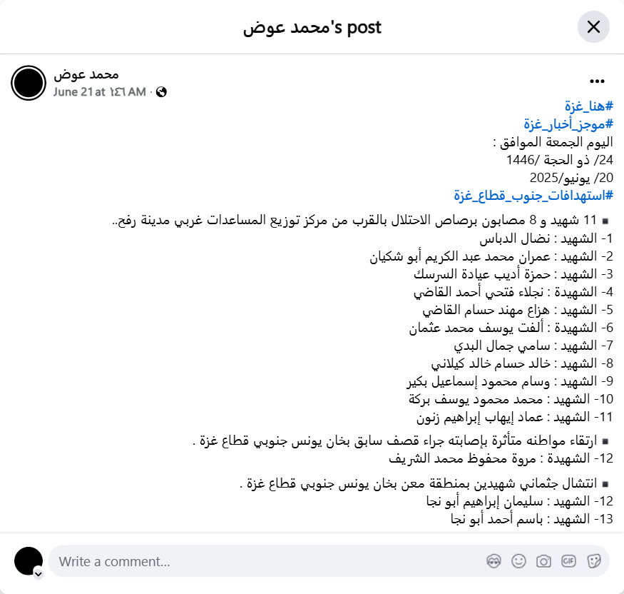 25 martyrs, the harvest of a new massacre against citizens who headed to the Netzarim aid point north of the Nuseirat camp in the central Gaza Strip. 28- Martyr: Mahmoud Salah Hajjaj 29- Martyr: Abdullah Mahmoud Hajjaj 30- Martyr: Ahmed Farouk Al-Sawalehi 31- Martyr: Mahmoud Al-Ashqar "Abu Hussein" 32- Martyr: Maysara Ahmed Abu Arab 33- Martyr: Abdul Karim Marwan Al-Souri 34- Martyr: Hussein Khalil Hussein Al-Souri 35- Martyr: Taher Al-Helou Abu Karam 36- Martyr: Ahmed Abdel Salam 37- Martyr: Loay Mohammed Al-Madhoun 38- Martyr: Mahmoud Mohammed Al-Za'anin "Marta" 39- Martyr: Osama Saad Mohammed Abdullah Al-Helou