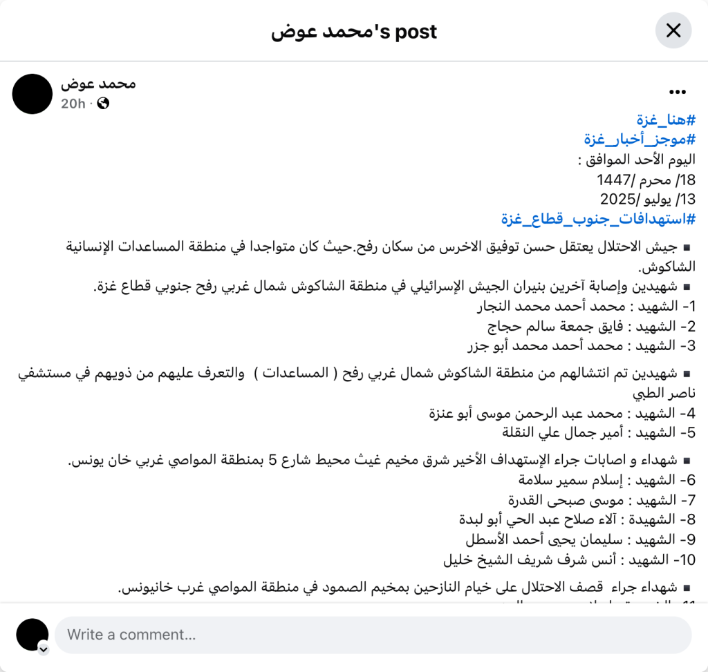 #Here_is_Gaza#Gaza_News_Summary Today Sunday: 18/Muharram/1447 July 13, 2025#Targeting_South_Gaza_Strip The occupation army arrested Hassan Tawfiq Al-Akhras, a resident of Rafah. He was present in the Al-Shakoush humanitarian aid area. Two martyrs and others were injured by Israeli army fire in the Al-Shakoush area northwest of Rafah, south of the Gaza Strip. 1- Martyr: Muhammad Ahmad Muhammad Al-Najjar 2- Martyr: Fayeq Jumaa Salem Hajjaj 3- Martyr: Muhammad Ahmad Muhammad Abu Jazar Two martyrs were recovered from the Al-Shakoush area northwest of Rafah (aid) and identified by their families in Nasser Hospital 4- Martyr: Muhammad Abd Al-Rahman Musa Abu Anza 5- Martyr: Amir Jamal Ali Al-Naqla Martyrs and injuries as a result of the recent targeting east of Ghaith camp, around Street 5 in the Al-Mawasi area west of Khan Yunis. 6- Martyr: Islam Samir Salama 7- Martyr: Musa Subhi Al-Qudra 8- Martyr: Alaa Salah Abdel-Hay Abu Labda 9- Martyr: Suleiman Yahya Ahmed Al-Astal 10- Martyr: Anas Sharaf Sharif Al-Sheikh Khalil Martyrs due to the occupation's bombing of the tents of the displaced in Al-Sumoud camp in the Al-Mawasi area west of Khan Yunis. 11- Martyr: Islam Sayed Abdel-Mazen 12- Martyr: Maria Nabil Ibrahim Abu Naqira 13- Martyr: Nidal Khalil Muhammad Al-Jundi Martyrs due to the occupation's bombing of the town of Bani Suhaila in the city of Khan Yunis, south of the Gaza Strip. 14- Martyr: Ayman Hussein Ibrahim Ahmed 15- Martyr: Moaz Ashraf Suleiman Qablan Martyrs affected by their injuries from a previous targeting in the city of Khan Yunis, south of the Gaza Strip. 16- Martyr: Mahmoud Ahmed Saleh Al-Ghalban 17- Martyr: Ahmed Hussein Muhammad Othman A citizen was martyred due to a Zionist raid in the vicinity of Asdaa prison in the city of Khan Yunis, south of the Gaza Strip. 18- Martyr: Muhammad Ziad Khalil Mutlaq Recovering martyrs from the town of Abasan Al-Kabira, east of the city of Khan Yunis, south of the Gaza Strip 19- The martyr: Anas Fathi Abu Farhana 20- The martyr: Muhammad Akram Abu Daqqa 21- The martyr: Hisham Hamdan Balousha 22- The martyr: Anas Abu Daqqa A citizen was killed as a result of targeting in Batn Al-Sameen in Khan Yunis Governorate, south of the Gaza Strip. 23- The martyr: Adam Farid Salem Za’rab 9 martyrs and more than 20 wounded as a result of an Israeli raid on a tent sheltering displaced people in Al-Hayya Street near the gate of the Qadisiya site in Mawasi Khan Yunis 24- The martyr: Abd Rabbuh Darwish Muhammad Al-Arja 25- The martyr child: Tayseer Alaa Tayseer Al-Sharif 26- The martyr: Hamed Ezz El-Din Hamed Abdel Aal 27- The martyr: Qamar Ezz El-Din Hamed Abdel Aal 28- The martyr: Ghaith Rabie Ahmed Al-Hamaideh 29- The martyr: Razan Adi Ismail Masmah 30- The martyr Sheikh: Abdullah Naji Abdullah Al-Majaida 31- The martyr: Bakr Muhammad Abdel Rahman 32- Martyr: Rami Al-Shaafi 5 injuries due to the sudden return of tanks near the Turkish reservoir south of the slaughterhouse area west of Khan Yunis in the southern Gaza Strip, coinciding with heavy shelling, bullets and helicopter fire. 5 martyrs in the bombing of a tent for displaced people, the family of journalist Hussam Al-Adlouni in the Mawasi area of Al-Qarara town, northwest of Khan Yunis city in the southern Gaza Strip. 33- Martyr: Hussam Saleh Al-Adlouni and his wife 34- Martyr: Suad Abdul Mahmoud Al-Adlouni and their children 35- Martyr: Abdul Rahman Hussam Saleh Al-Adlouni 36- Martyr: Shahd Hussam Saleh Al-Adlouni 37- Martyr: Fairouz Hussam Saleh Al-Adlouni Retrieving the body of a citizen who was martyred as a result of the bombing of the occupation forces in the town of Abasan Al-Kabira in Khan Yunis Governorate, south of the Gaza Strip. 38- Martyr: Akram Abdul Rahman Nasr Martyrdom of Sheikh Professor Raed Al-Darbi as a result of targeting his tent in the Mawasi area of Khan Yunis. 39- Martyr Sheikh: Raed Al-Darbi Targeting of the Gaza Youth Center in Al-Mawasi, northwest of Khan Yunis, No injuries .. Evacuation reported Occupation aircraft launched a raid on the Ard Al-Manga area southwest of Khan Yunis city, south of the Gaza Strip. A martyr is in Nasser Hospital, a resident of Rafah 40- Martyr: Muhammad Husni Muhammad Bishnak #Central_Targetings Martyrs as a result of an Israeli bombing that targeted a house for the Abu Jihad Al-Arbid family in the Al-Sawarah area, west of Al-Nuseirat camp, central Gaza Strip. 41- Martyr: Abu Jihad Jamal Al-Arbid 42- Martyr: Umm Jihad Jamal Al-Arbid 43- Martyr: Muhammad Abu Jihad Jamal Al-Arbid 44- Martyr: Ramadan Al-Arbid 45- Martyr: Ahmad Abu Jihad Jamal Al-Arbid 46- Martyr: Islam Abu Jihad Jamal Al-Arbid 47- Martyr: Hiba Al-Arbid (his son’s wife) Martyrs from the Al-Zawara’a family home as a result of damage from the bombing of the Al-Arbid home 48- Martyr: Zain Hazem Al-Zawara’a 49- Martyr: Raed Hazem Al-Zawara’a 50- Martyr: Leen Hazem Al-Zawara'a 51- Martyr: Farah Hazem Al-Zawara'a A child was martyred due to hunger... 52- Martyr: Salam Abu Wadi 10 martyrs, including 6 children, when the occupation targeted a gathering of citizens at a water distribution point in Al-Nuseirat camp in the middle of the Gaza Strip. 53- Martyr: Fuad Salama Nassar 54- Martyr: Ahmed Salim Abu Salmiya 55- Martyr: Mohammed Mahmoud Muslim Qaraman 56- Child martyr: Badr Al-Din Qaraman. 57- Child martyr: Abdullah Yasser Ahmed 58- Child martyr: Siraj Khaled Ibrahim. 59- Child martyr: Ibrahim Ashraf Abu Urayban 60- Child martyr: Karam Ashraf Al-Ghussein 61- Child martyr: Lana Ashraf Al-Ghussein. 62- The martyr: Qassim Mahmoud Al-Minawi. An injury was recovered near the wedding hall as a result of a quad bomb explosion. The injured: Badr Tabaza. Targeting a house belonging to the Saeed family east of Al-Maghazi camp and the house had been previously evacuated. Gunfire north of Al-Bureij camp and some gunshots reached the tents of the displaced in the Al-Sikka shelter (Al-Muntazah). Martyrs as a result of targeting a group of citizens in front of Thabet Aluminum shops, Bir 