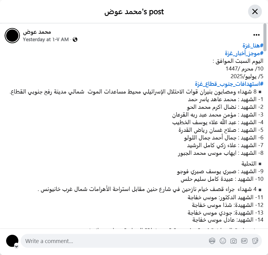 A citizen, his wife and children were martyred as a result of the bombing of his tent near the Dream Plus Hall, west of Khan Yunis, in the southern Gaza Strip. 23- Martyr: Fahd Muhammad Abu al-Khair 24- Martyr: His wife and their children 25- Martyr: Yazan Fahd Muhammad Abu al-Khair (12 years old) 26- Martyr: Amjad Fahd Muhammad Abu al-Khair (10 years old) 27- Martyr: Muhannad Fahd Muhammad Abu al-Khair (7 years old) 28- Martyr: Muhammad Fahd Muhammad Abu al-Khair (6 years old)