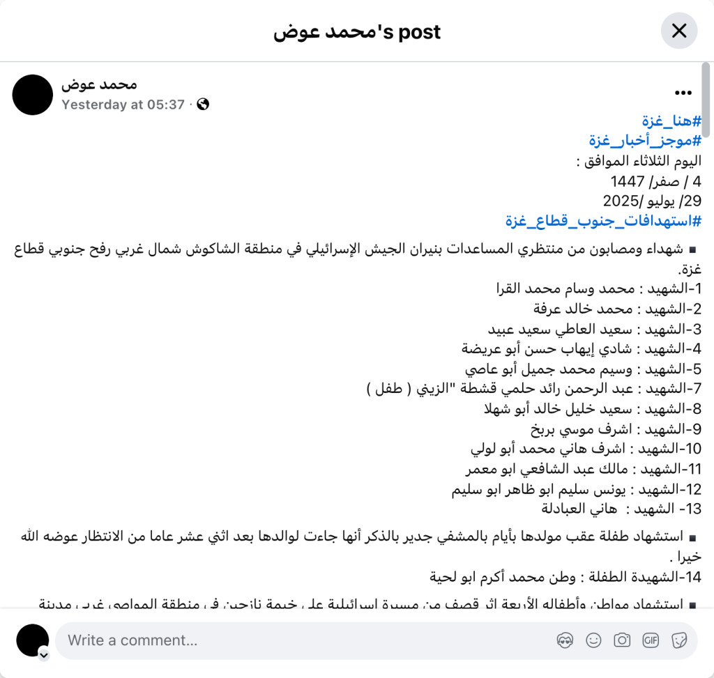 Martyrs and wounded among those waiting for aid by Israeli army fire in the Al-Shakoush area, northwest of Rafah, in the southern Gaza Strip. 1- Martyr: Muhammad Wissam Muhammad Al-Qarra