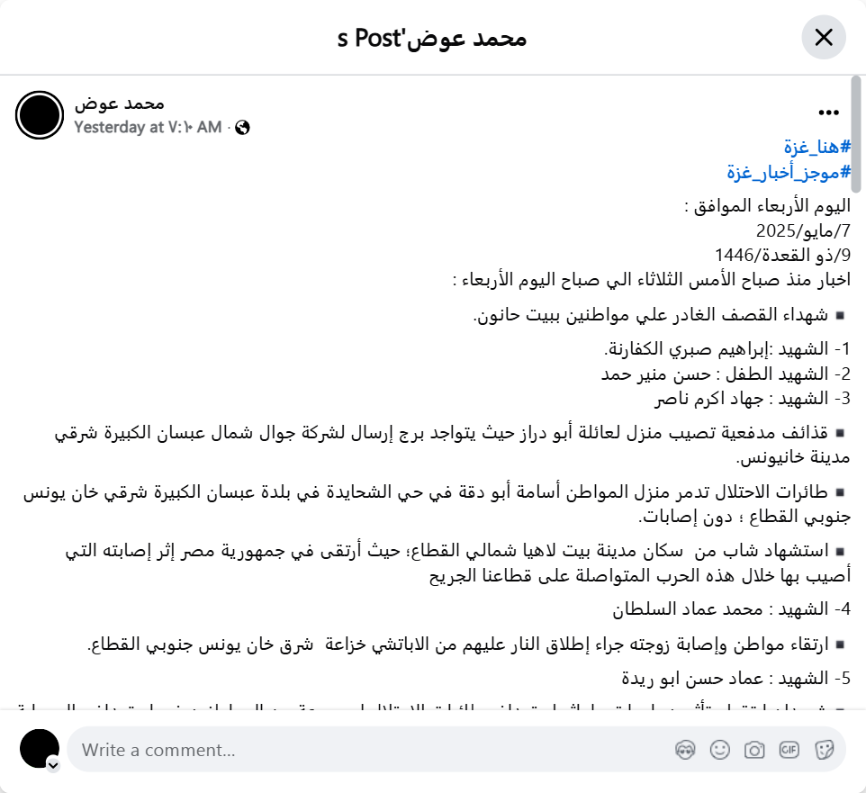 A martyr and an injured person were killed when a tent sheltering displaced people was targeted in Al-Rahma camp near the Turkish slaughterhouse west of Khan Yunis. 9- Martyr: Muhammad Iyad Fuad Al-Tabasi