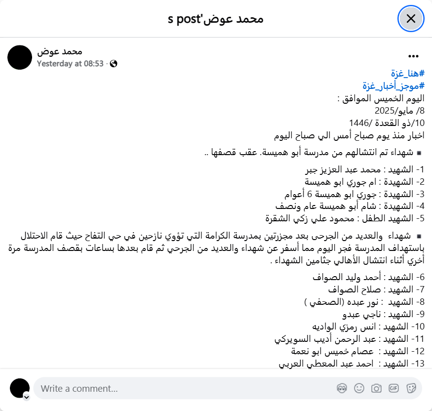 #Here_is_Gaza#Gaza_News_Summary Today, Thursday, corresponding to: May 8, 2025, 10/Dhu al-Qi'dah/1446 News from yesterday morning until this morning Martyrs were recovered from Abu Hamisa School. After its bombing .. 1- The martyr: Muhammad Abdul Aziz Jabr 2- The martyr: Umm Jourieh Abu Hamisa 3- The martyr: Jourieh Abu Hamisa, 6 years old 4- The martyr: Sham Abu Hamisa, a year and a half 5- The martyr child: Mahmoud Ali Zaki Al-Shaqra Martyrs and many wounded after two massacres in Al-Karama School, which shelters displaced people in Al-Tuffah neighborhood, where the occupation targeted the school at dawn today, resulting in martyrs and many wounded, and then hours later it bombed the school again while the residents were recovering the bodies of the martyrs. 6- The martyr: Ahmed Walid Al-Sawaf 7- The martyr: Salah Al-Sawaf 8- The martyr: Nour Abdo (Journalist) 9- The martyr: Naji Abdo 10- The martyr: Anas Ramzi Al-Wadieh 11- The martyr: Abdul Rahman Adeeb Al-Suwairki 12- The martyr: Issam Khamis Abu Nimah 13- The martyr: Ahmed Abdul-Muati Al-Arabi 14- Martyr: Farid Al-Mashharawi (Abu Shadi) 15- Martyr: Ismail Khalil Mansour Abu Khalil 16- Martyr: Laila Youssef Mansour Umm Khalil. His wife 17- Martyr: Khalil Ismail Khalil 18- Martyr: Youssef Al-Fayoumi 19- Martyr: Baraa Al-Haddad 20- Martyr: Muhammad Majid Hussein Al-Nakhala 21- Martyr: Saeed Faraj Al-Saftawi 22- Martyr: Muhammad Faraj Al-Saftawi 23- Martyr: Mahmoud (Musa) Al-Habashi (Abu Muhammad) 24- Martyr: Muhammad Issam Al-Dahdar 25- Martyr: Bilal Issam Al-Dahdar 26- Martyr: Muhammad Osama Al-Dahdar 27- Martyr: Rami Fathi Al-Dahdar 28- Martyr: Ibrahim Ghassan Al-Dahdar 29- Martyr: Muhammad Tayseer Al-Batsh 30- Martyr: Shadi Muhammad Al-Batsh 31- Martyr: Muhammad Amer Marzouq 32- Martyr: Mona Al-Jadd 33- Martyr: Bilal Hazem Al-Zaqzouq 34- Martyr: Marihan Ghassan Al-Bahtini (His wife) 35- The child martyr: Malak Bilal Al-Zaqzouq (their daughter) 36- The child martyr: Talia Bilal Al-Zaqzouq (their daughter) Two martyrs as a result of the enemy forces targeting a tent in Deir Al-Balah next to Al-Aqsa Hospital 37- The martyr: Nasr Ibrahim Juma Abu Suhaib 38- The martyr: Hayat Nasr Ibrahim Juma Abu Suhaib (his daughter) Hajj Adham Abu Abli (Abu Ali) passed away, may God have mercy on him 4 were injured by Israeli drone fire in Beit Hanoun, northern Gaza Strip: They are: The injured: Muhammad Ahmad Wahdan The injured: Eid Ahmad Wahdan The injured: Abdul Raouf Wahdan The injured: Saber Ahmad Wahdan Martyr as a result of targeting by reconnaissance aircraft east of Gaza. 39- The martyr: Bilal Muhammad Amin Al-Nakhala Martyrs and wounded in an Israeli bombardment on the Al-Waha area, northwest of Gaza City. 40- The martyr: Nabil Ahmad Al-Halabi 41- The martyr: Ahmad Hisham Omar, martyr and injured in an Israeli bombing that targeted a group of citizens in the town of Abasan al-Jadida, east of Khan Yunis, south of the Gaza Strip. 42- The martyr hero: Jihad Mahmoud Asfour. Martyrs as a result of targeting west of al-Karama roundabout, northwest of Gaza City: 43- The martyr: Ghassan Abu Khusa 44- The martyr: Yousef Abu Khusa 45- The martyr: Raed Dabab Several attacks by the occupation’s artillery and quadcopter aircraft in the vicinity of al-Mahta Mosque and Yaffa Street in al-Tuffah neighborhood, east of Gaza City. The number of martyrs of the occupation’s massacre at the Thai restaurant and the surrounding popular market, west of Gaza City, rises to 25, and dozens of wounded, some of whom are in critical condition. 46- The martyr: Yahya Basil Naim 47- The martyr: Sari Jamal Naim 48- The martyr: Yahya Subaih (the journalist) 49- The martyr: Rami Mu’in Subaih (his sister’s husband) 50- The martyr: Muhammad Zuhair Adwan 51- The martyr: Murid Muhammad al-Sheikh Eid 52- The martyr : Ahmed Bashir Al-Gharabli 53 - Martyr: Khaled Yahya Rabah Nasser 54 - Martyr: Mohammed Jabr Abu Odeh 55 - Martyr: Mahmoud Ibrahim Al-Brim 56 - Martyr: Yousef Abu Halima Abu Haitham 57 - Martyr: Hamada Rasmi Baraka (Abu Ghanima) 58 - Martyr: Prince Mustafa Akram 59 - Martyr: Ahmed Omar Al-Amoudi 60 - Martyr: Muammar Saadi Lulu 61 - Martyr: Mazid Al-Zamili 62 - Martyr: Abdullah Jamil Al-Ra’i 63 - Martyr: Mohammed Ghazi Al-Yaziji 64 - Martyr: Anas Zakaria Abu Hajar 65 - Martyr: Karam Ahmed Qunaita 66 - Martyr: Hadi Nahedh Qanou 67 - Martyr: Kamal Salman Marish 68 - Martyr: Sami Rabah Sami Al-Skafi 69 - Martyr: Khader Fares Abdo 70 - Martyr: Ahmed Ibrahim Abu Saif (child) 71 - Martyr: Noah Daoud Al-Saqa (child) 72 - Martyr : Badi Khalil Hanouneh (Abu Muhammad) martyred by the occupation’s bombing of Tal al-Hawa neighborhood, southwest of Gaza City. 73- Martyr: A citizen died of his wounds as a result of a previous attack in the Nuseirat camp in the middle of the Strip. 74- Martyr: Nabil Abu Fayyad “Abu Naseem” Martyrs as a result of the “Israeli” occupation’s bombing of a group of citizens in the al-Sawariha area in the middle of the Gaza Strip: 75- Martyr: Ahmed Ismail Abu Suwairih 76- Martyr: Tawfiq Kassab 77- Martyr: Child Yahya Tariq Abu Suwairih Martyrs and a number of injuries as a result of targeting a house belonging to the citizen Salama al-Badi in the al-Manshiya neighborhood in the city of Beit Lahia, north of the Strip. 78- Martyr: Salama Jamal al-Badi 79- Martyr: Widad al-Badi (Umm Sami) 80- Martyr: Hadeel Jamal al-Badi 81- Martyr: Mona Mai (Sami’s wife) 82- Martyr: Hanan Saad al-Badi and her son 83- Martyr child: Jamal Muhammad al-Badi 84- Martyr: Haitham Thabet 85- Martyr: Razan Salama (Haitham’s wife) A child was martyred after being shot by gunboats off the coast of the Gaza Strip this afternoon 86- Martyr: Child Uday Muhammad Hassouna Injuries due to shelling that targeted citizens near the Sunday market in the town of Abasan al-Kabira, east of Khan Yunis. 87- Martyr: Ihab Shawqi Abu Salah 88- Martyr: Child Ahmad Imad Abu Tayr 89- Martyr: Child Tamam Muhammad Ismail Abu Tayr 90- Martyr: Child Alma Muhammad Ali Abu Tayr Martyrdom o