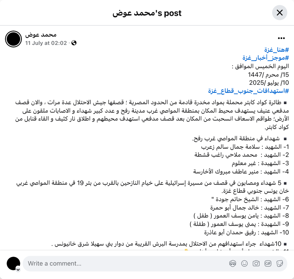 Archive URL: https://airwars.org/source/www-facebook-com-%d9%85%d8%ad%d9%85%d8%af-%d8%b9%d9%88%d8%b6-pfbid0vmrhwruh2suvyosywim5g8hskohcxuxt3yxf57xy6oh23rs7vji447d3znohtgwyl-2025-07-10-230200-20/
