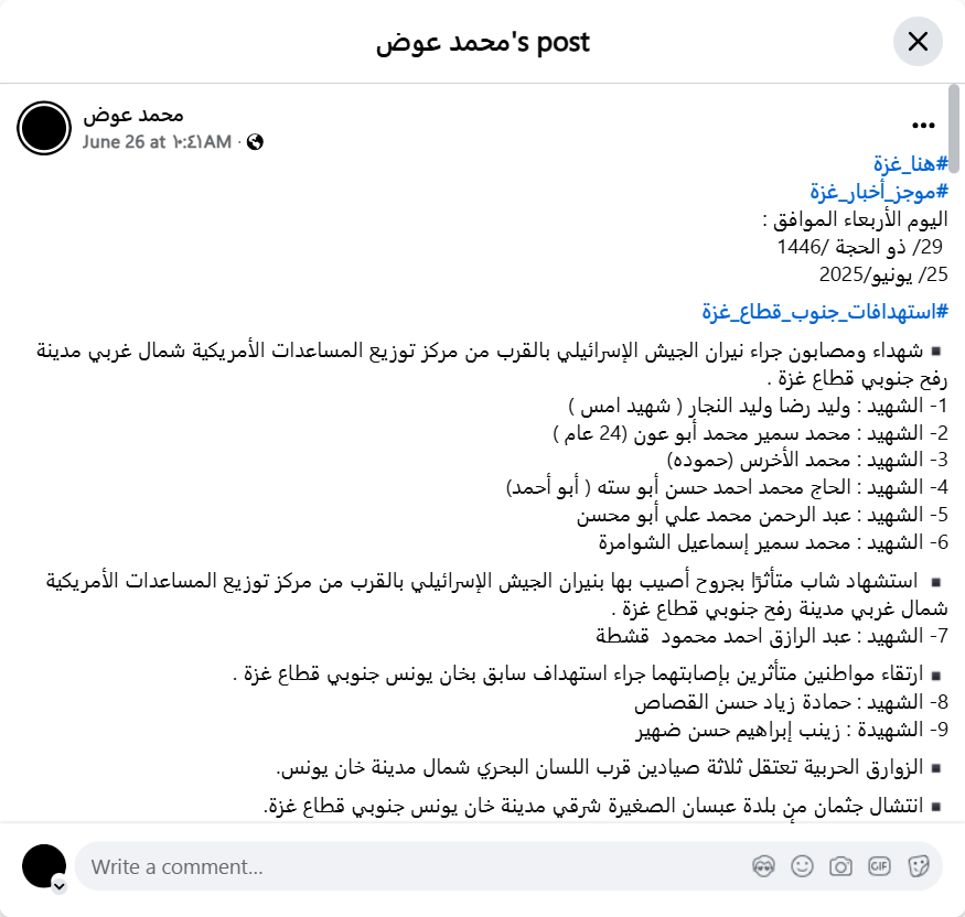 Martyrs and wounded as a result of Israeli army fire near the US aid distribution center northwest of Rafah city in the southern Gaza Strip. 1- Martyr: Walid Reda Walid Al-Najjar (yesterday's martyr) 2- Martyr: Muhammad Samir Muhammad Abu Aoun (24 years old) 3- Martyr: Muhammad Al-Akhras (Hamouda) 4- Martyr: Hajj Muhammad Ahmad Hassan Abu Sitta (Abu Ahmad) 5- Martyr: Abdul Rahman Muhammad Ali Abu Mohsen 6- Martyr: Muhammad Samir Ismail Al-Shawamreh