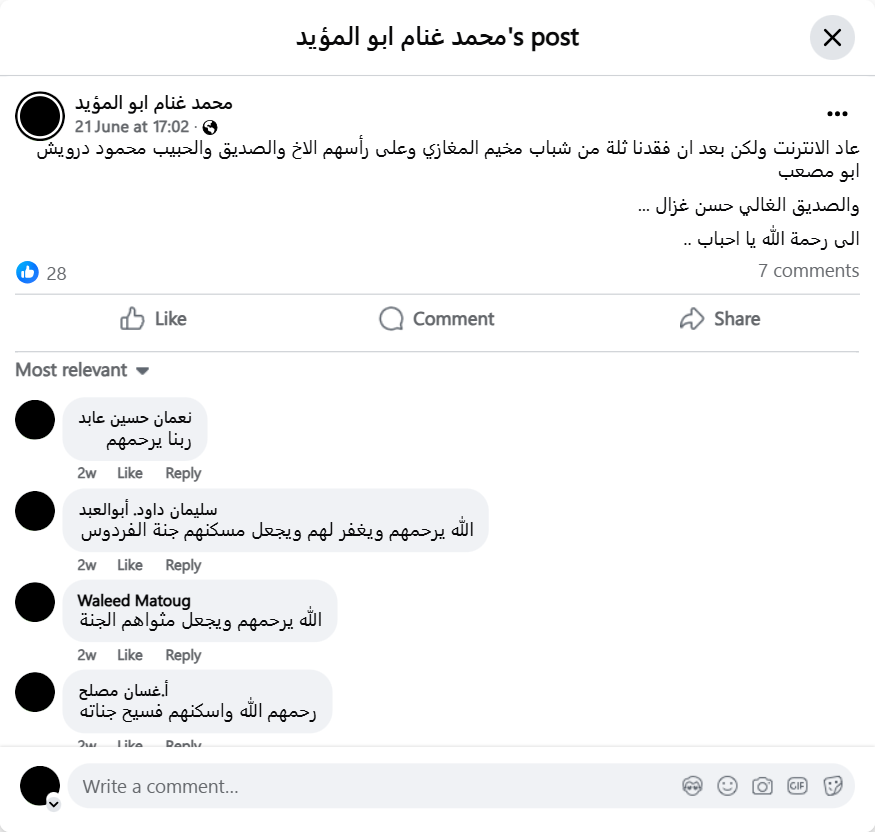 The internet is back, but after we lost a group of young men from Al-Maghazi camp, headed by our brother, friend, and beloved Mahmoud Darwish, Abu Musab, and our dear friend Hassan Ghazal... May God have mercy on them, my beloved ones.