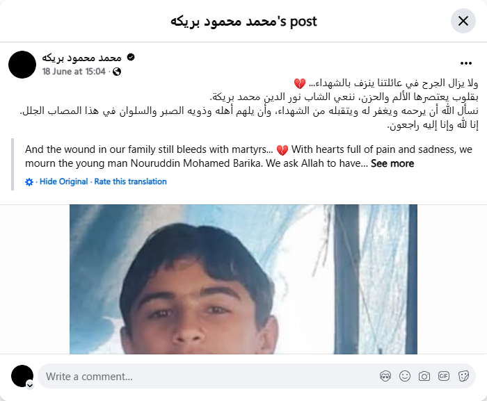The wound in our family still bleeds with martyrs... With hearts filled with pain and sadness, we mourn the young man Nour Eddine Mohamed Brika.