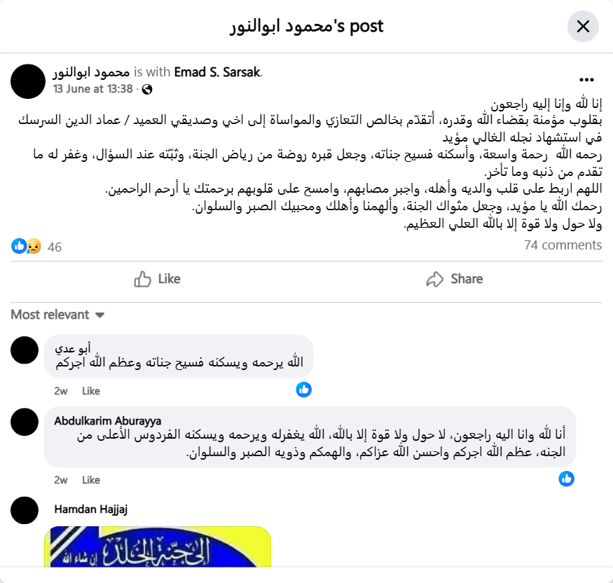 إنا لله وإنا إليه راجعونبقلوب مؤمنة بقضاء الله وقدره، أتقدّم بخالص التعازي والمواساة إلى اخي وصديقي العميد / عماد الدين السرسك في استشهاد نجله الغالي مؤيد رحمه الله رحمة واسعة، وأسكنه فسيح جناته، وجعل قبره روضة من رياض الجنة، وثبّته عند السؤال، وغفر له ما تقدم من ذنبه وما تأخر.اللهم اربط على قلب والديه وأهله، واجبر مصابهم، وامسح على قلوبهم برحمتك يا أرحم الراحمين.رحمك الله يا مؤيد، وجعل مثواك الجنة، وألهمنا وأهلك ومحبيك الصبر والسلوان.ولا حول ولا قوة إلا بالله العلي العظيم.